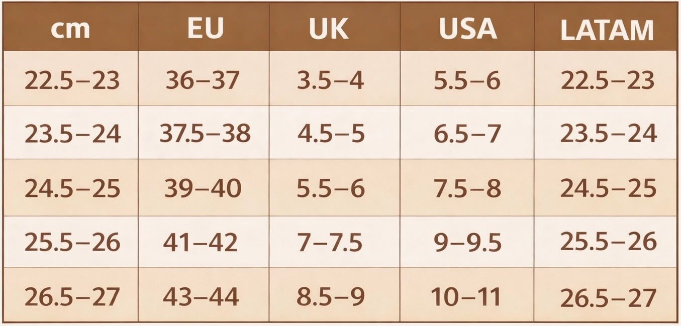 ¿Necesitas ayuda con la guía de tallas? Si no estás segura de tu talla o quieres confirmar tu medida, contáctanos y nuestro equipo te ayudará a elegir el calzado perfecto.